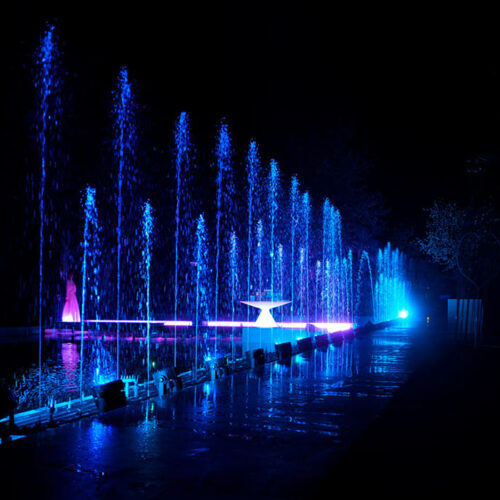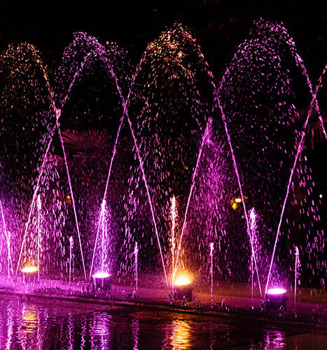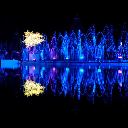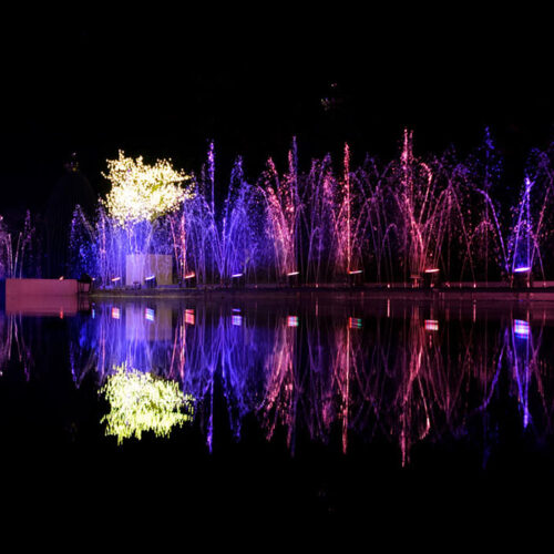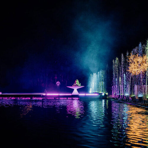 As cores vibrantes e as explosões luminosas refletem-se no lago, criando um efeito mágico e romântico.