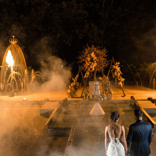Ao som de uma melodia romântica, os noivos olham-se nos olhos, prontos para celebrar o início de uma nova jornada juntos. Com um sorriso radiante, eles cortam a primeira fatia do bolo, selando assim sua união. A noite intensifica-se com um espetáculo de fogos de artifício que ilumina o céu noturno.
